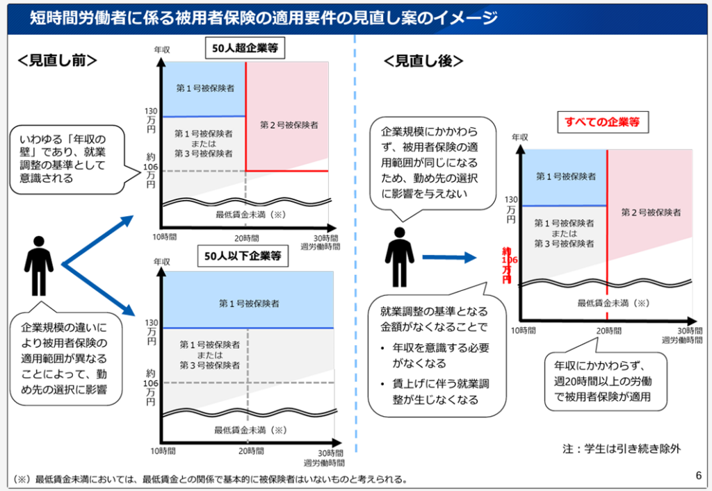 厚生労働省は短時間労働者の厚生年金への加入を拡大しようと、企業規模の要件に加えて、月額8万8000円以上とする賃金の要件も撤廃するかどうか検討を進めています。撤廃されれば、いわゆる「年収106万円の壁」が解消されることになります。