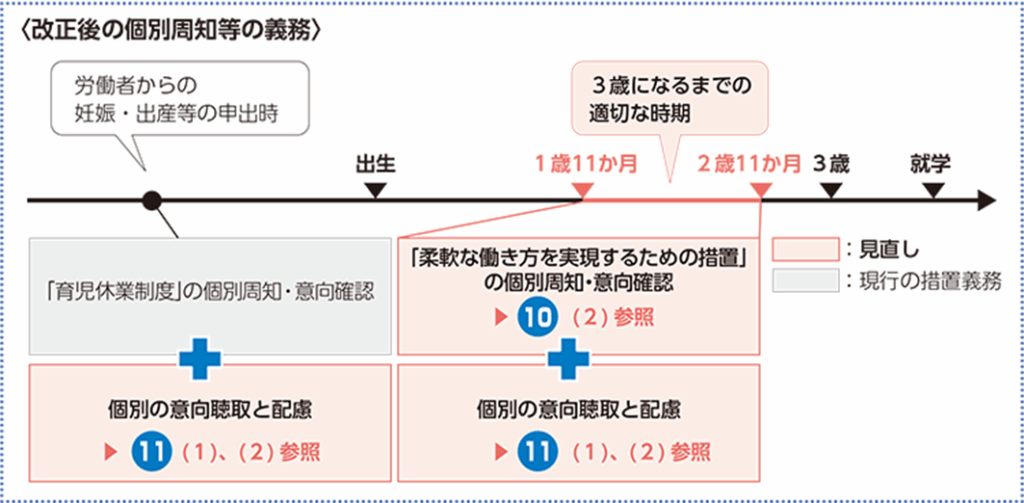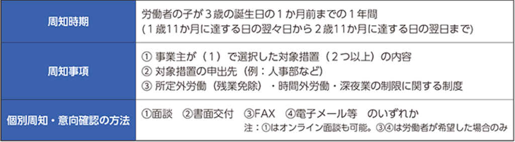 3歳未満の子を養育する労働者に対して、子が3歳になるまでの適切な時期に、事業主は柔軟な働き方を実現するための措置として(1)で選択した制度(対象措置)に関する以下の事項の周知と制度利用の意向の確認を、個別に行わなければなりません。