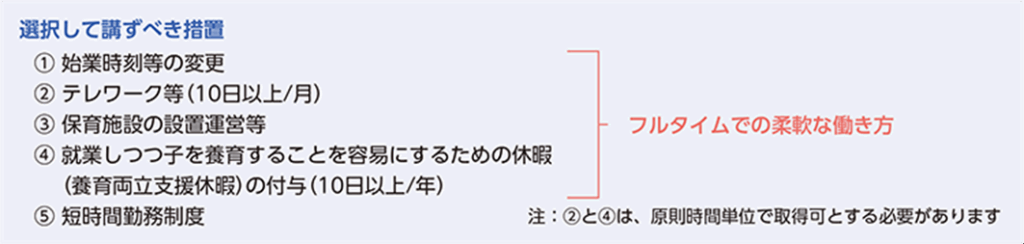 ・事業主は、3歳から小学校就学前の子を養育する労働者に関して、以下5つの選択して講ずべき措置の中から、2つ以上の措置を選択して講ずる必要があります。