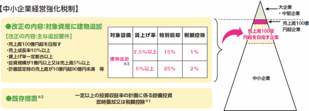 ■地域経済の好循環を生み出していくため、中小企業経営強化税制を拡充し、売上高100億円超を目指す中小企業が行う一定規模以上の設備投資について、インセンティブ措置を講じます。