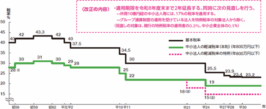 (注)中小法人の軽減税率の特例(年800万円以下)について、平成21年4月1日から平成24年3月31日の間に終了する各事業年度は18%、平成24年4月1日前に開始し、かつ、同日以後に終了する事業年度については経過措置として18%、平成24年4月1日から令和9年3月31日の間に開始する各事業年度は15%。