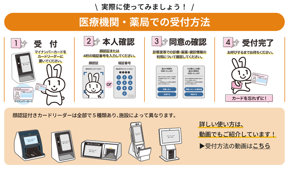 ※暗証番号(数字4桁)を忘れてしまった場合は、医療機関・薬局の受付の顔認証付きカードリーダーでワンタッチで利用登録ができます!その後お手すきの際に、お住まいの市区町村の窓口で再設定をしてください。